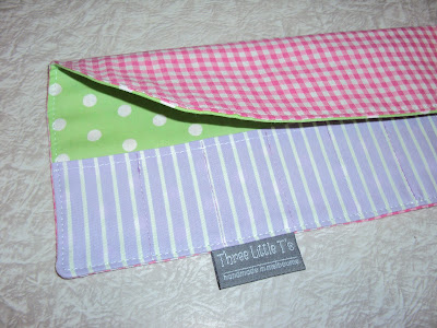 I am happy with how it turned out however I didn't like seeing the stitching on the back of the roll (since you just turn up the bottom part to make the pocket and stitch through that to make the texta/crayon pockets). I love the bias edging so will try modifying the way the roll is put together and come up with my own version. I used 1 layer of whisper weft interfacing and found it worked perfectly to give the roll the tiniest bit of body. Previously the interfacing I've used has made the roll much too stiff. I like rolls with the fold down top flap which ensures the texta's stay put. I don't see the point (at all!) of the rolls that don't have the top flap??