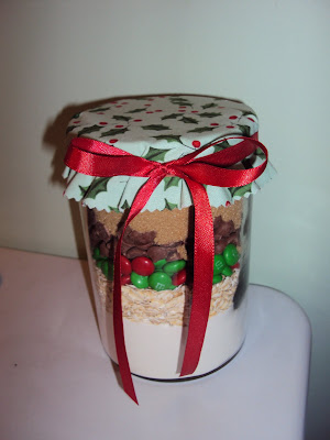 Although not sewing, Cookies in a Jar is still handmade and from the heart. I saw this idea on Bakerella's website a few months ago and knew I had to make it for her as soon as I saw it. After M and I assembled it, I couldn't stop looking at it. So pretty!