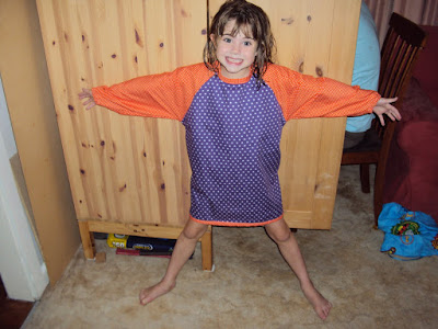 doggy dress up suit to make this art smock. I am pleased with how it turned out however it is much too halloween-ish for my liking. M chose the purple stars but we didn't have enough for the whole smock so I used the orange aswell.
