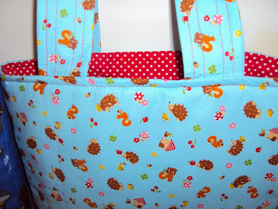 I am completely in love with the hedgehog fabric matched with the red dotty fabric, which kind of just *happened* as I was sorting through my stash. I wasn't too fussed with the hedgehog fabric (which I bought ages ago) but the further along I got with the bag, the more I fell in love and now I wish I had more.