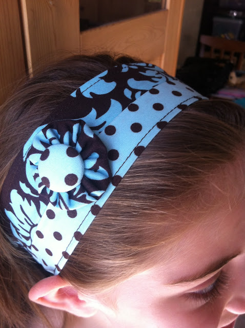 This started out as a reversible headband but when I was ironing it I thought it looked pretty cool half and half, a kind of mishmash. So I went with it and topped it off with a yo-yo and fabric covered button.